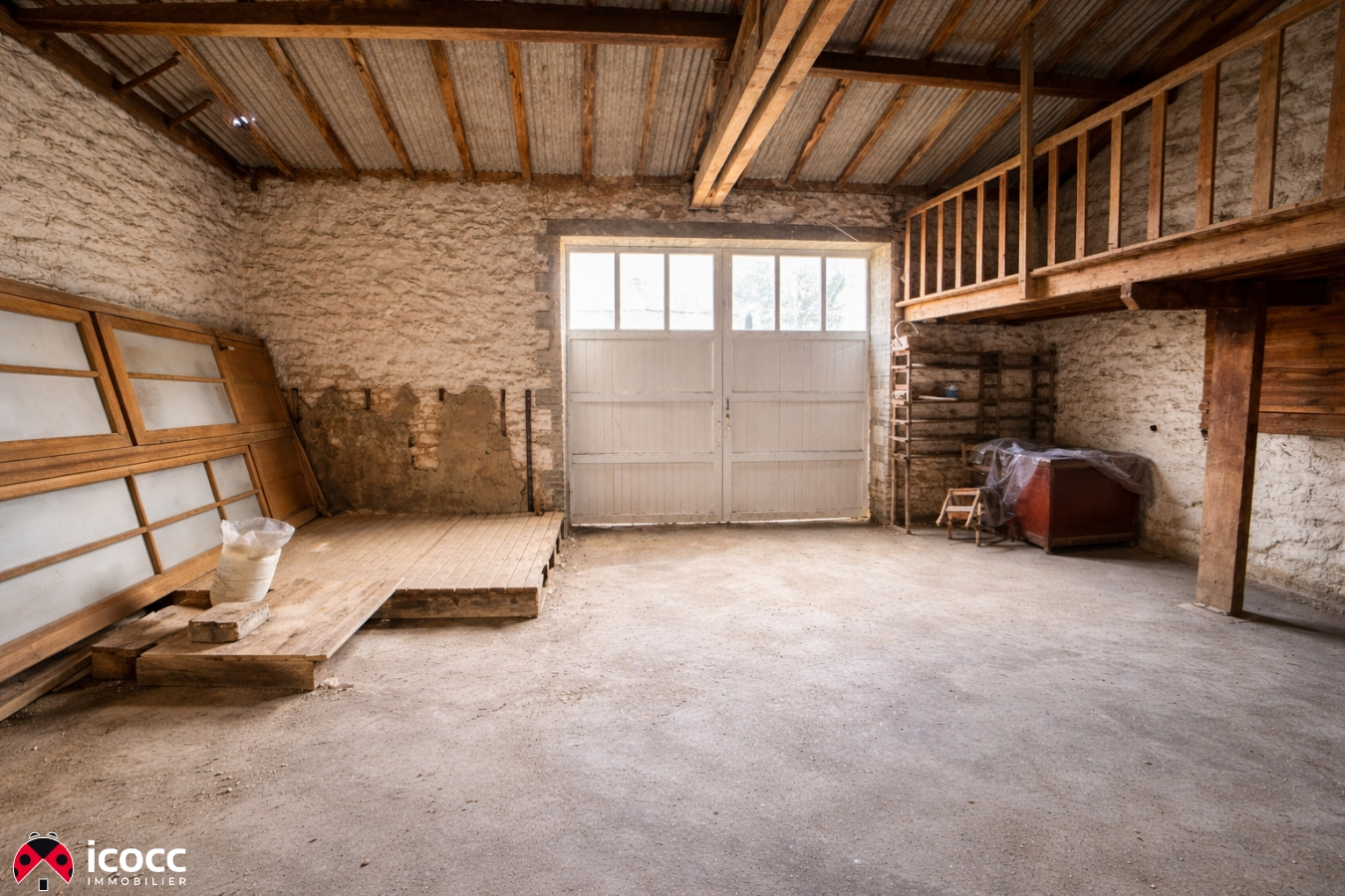 Un très grand garage en pierre avec mezzanine complète l’ensemble, idéal pour plusieurs véhicules, du stockage ou un futur aménagement.